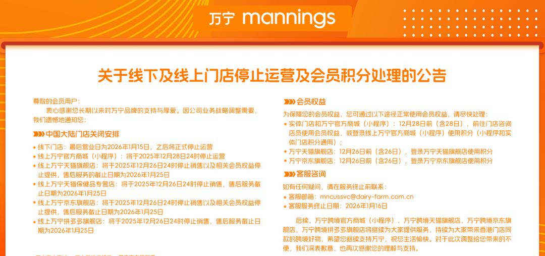 昨日(12月16日),香港大型的健与美产品连锁店万宁在其官网发布正式公告,表示其中国内地线下门店将于2026年1月15日之后正式停止运营,消费者可在12月28日前(含28日),前往门店咨询店员使用会员权益,或登录万宁官方商城(小程序)使用积分。