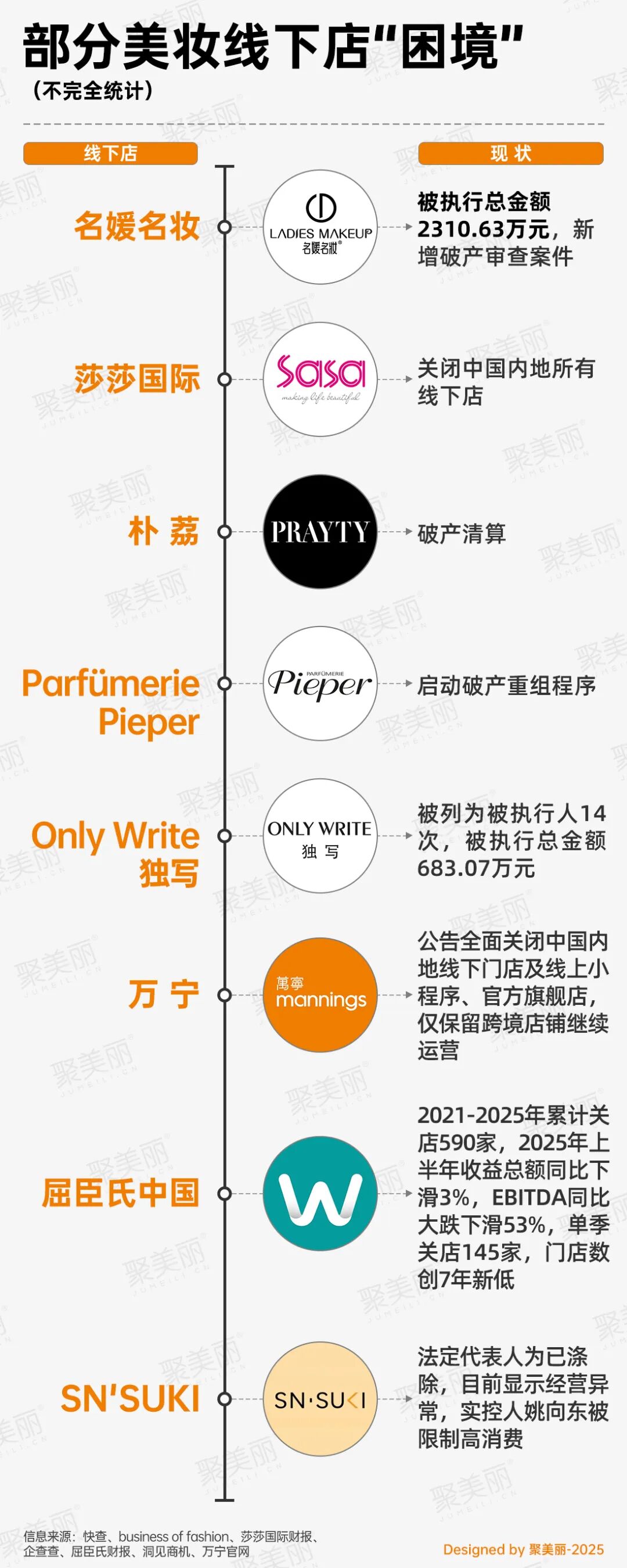 上图可见,除莎莎国际、万宁、屈臣氏外,近年来已有多个美妆连锁门店走入破产、经营异常的境地。