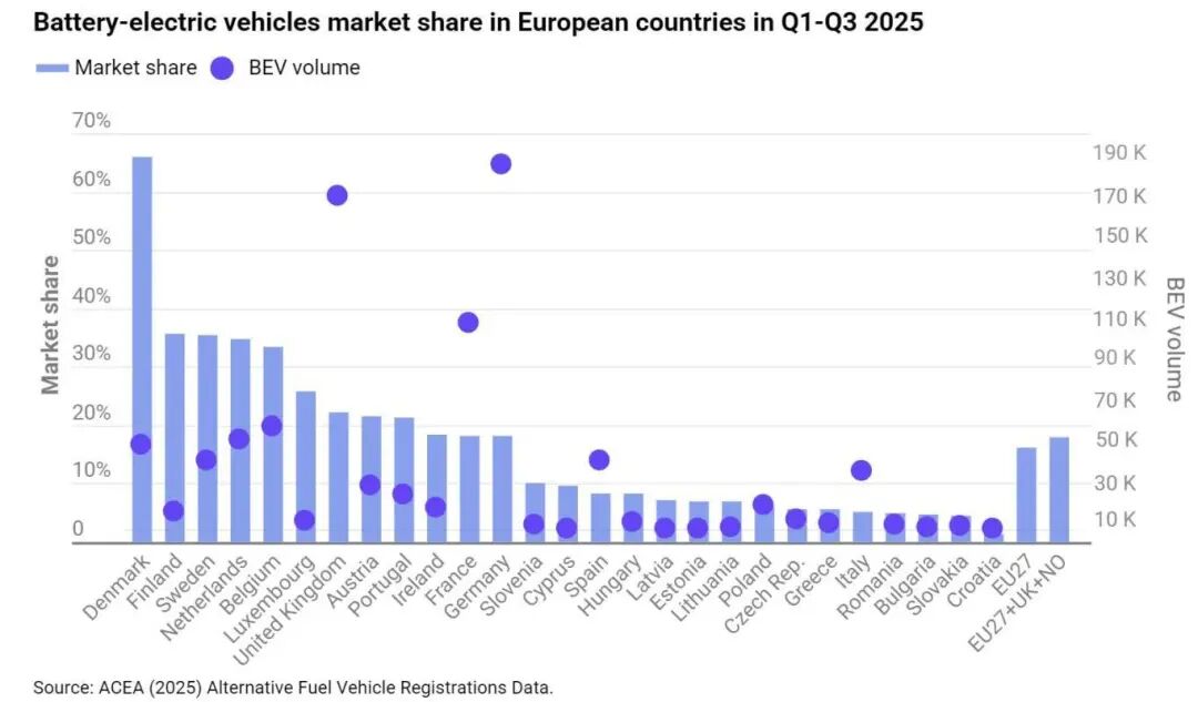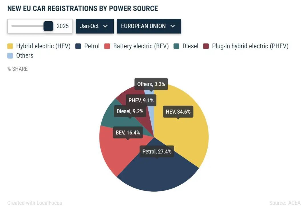 其实,数据最有说服力。欧洲电动车市场的整体趋势是平稳加速。2025Q3,欧盟纯电动汽车销售份额达到17.4%历史新高;1-10月,欧盟共注册了1,473,447辆新纯电动汽车,占市场份额的16.4%。欧盟最大的四个市场(合计占纯电动汽车注册量的62%)均实现了增长:德国(+39.4%)、比利时(+10.6%)、荷兰(+6.6%)和法国(+5.3%)。