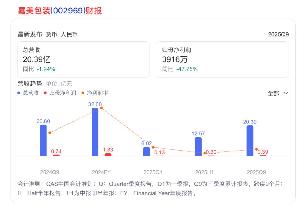 需要注意的是,今年前三季度,嘉美包装营业收入约20.39亿元,同比下降1.94%,归母净利润约3916万元,同比下降47.25%。这,或许也是该公司选择“易主”的主要原因。根据嘉美包装公告,原股东中包香港及陈民承诺,公司原有业务在2026-2030年的五个会计年度内,每年归母净利润不低于1.2亿元,若未达标需向上市公司进行现金补偿。