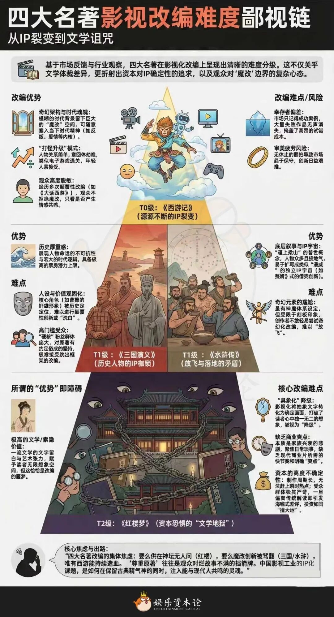 是的,四大名著在改编难度上存在着一条清晰的“鄙视链”——从T0级别的《西游记》到地狱难度的《红楼梦》。这背后的原因,不仅关乎文学体裁的差异,更折射出当下观众对历史、英雄以及魔改边界的复杂心态。