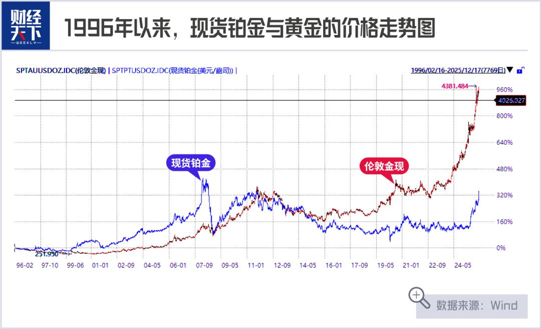 如果从1997年2月1日算起,到2025年12月17日,铂金的价格涨幅为448.89%,而黄金的价格涨幅为1154.41%,两者涨幅相差705.52%。