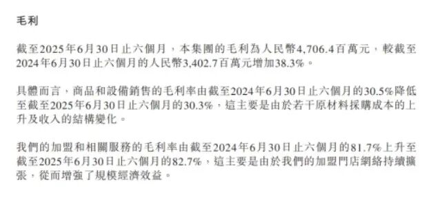 表面上看这项成绩相当亮眼,可同期的毛利增速仅为38.3%。在企业规模扩大的情况下,规模效应凸显,单位成本下降,毛利增长应该高于营收增速,但蜜雪冰城的核心业务“商品和设备销售”的毛利率却从2024年的30.5%掉到了30.3%。这意味着繁荣背后的利润问题仍然有些局促。