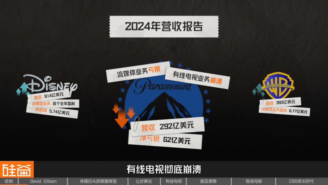2024年,迪士尼营收914亿美元,流媒体业务实现了首个全年盈利,净利润达到5.74亿美元;华纳兄弟探索营收393亿美元,流媒体盈利6.77亿美元。相比之下,派拉蒙2024年营收仅292亿美元,净亏损62亿美元,流媒体还在亏损,有线电视彻底崩溃,昔日制片厂巨头威风不在。