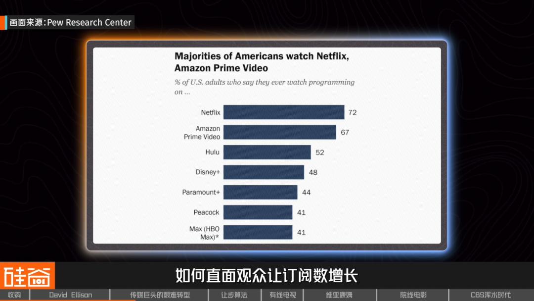 然后Disney因为也建立起了自己的一个小小的bundle(组合订阅),就包含了Disney+,hulu,以及这个新推出的体育的流媒体ESPN+,也很有可能幸存。那剩下来的一到两张传票,竞争者就是包括Paramount+、HBO Max以及Peacock。所以现在David Ellison就迫不及待需要通过这个收购,然后能够争取到最后一张船票。