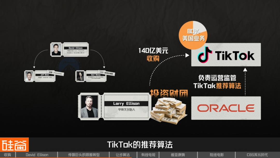 就在David Ellison收购派拉蒙的同时,他的父亲、甲骨文创始人Larry Ellison正领衔一个投资财团,以140亿美元收购TikTok美国业务80%的股份。甲骨文将负责运营和监管TikTok的推荐算法,这意味着Ellison家族有可能重新定义21世纪的媒体权力版图。
