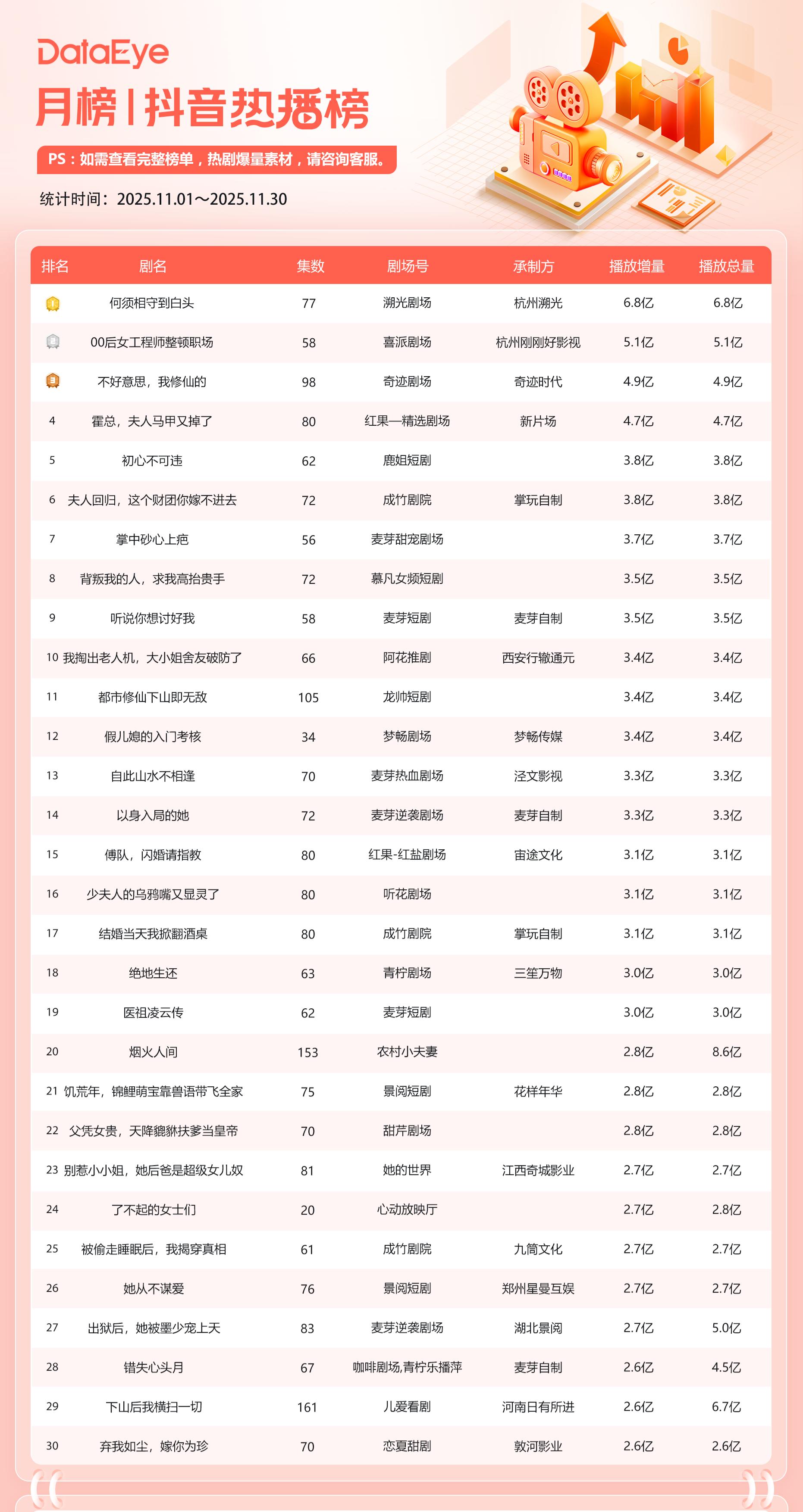 从播放量来看,2025年11月,百强热播剧播放增量均超1.8亿,其中共有74部微短剧播放增量超2亿,19部微短剧播放增量超3亿。