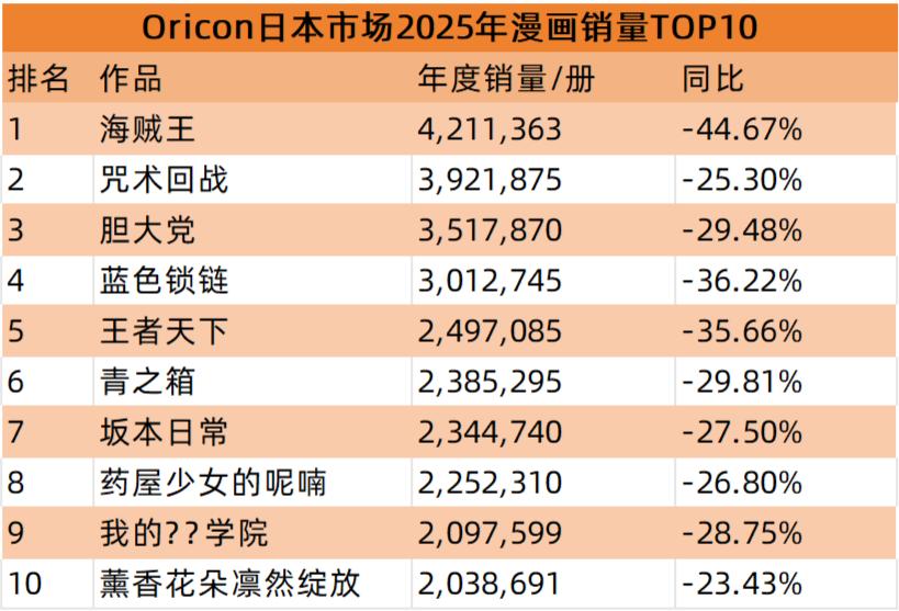 O ricon数据显示,2025年日本漫画销量前十分别为海贼王、 咒术回战、胆大党、蓝色锁链、王者天下、青之箱、坂本日常、药屋少女的呢喃、我的??学院、薰香花朵凛然绽放。