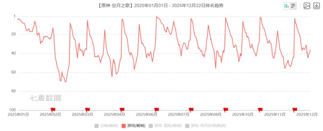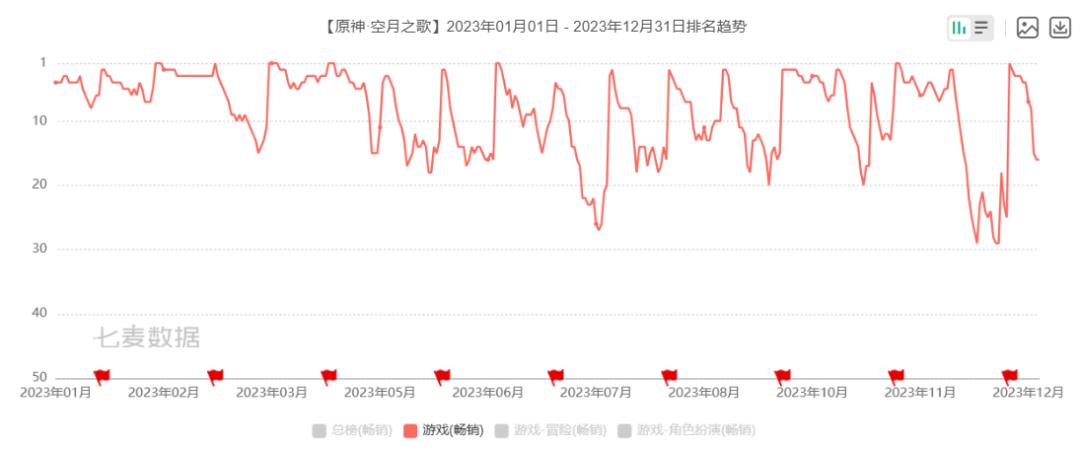 比如米哈游《原神》,2024上半年基本都保持在iOS中国区游戏畅销榜的前二十,如今一般是在20-60名之间,在推出运营活动的时候才会冲回前二十。