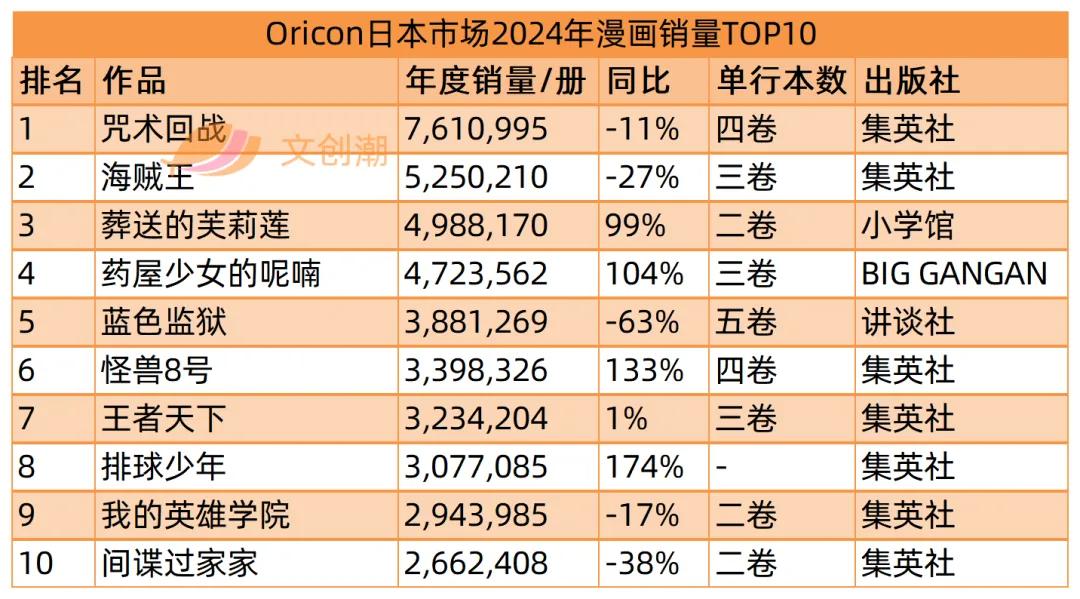 日本漫画2024销量TOP10:《咒术回战》重返第一,《海贼王》单卷最高