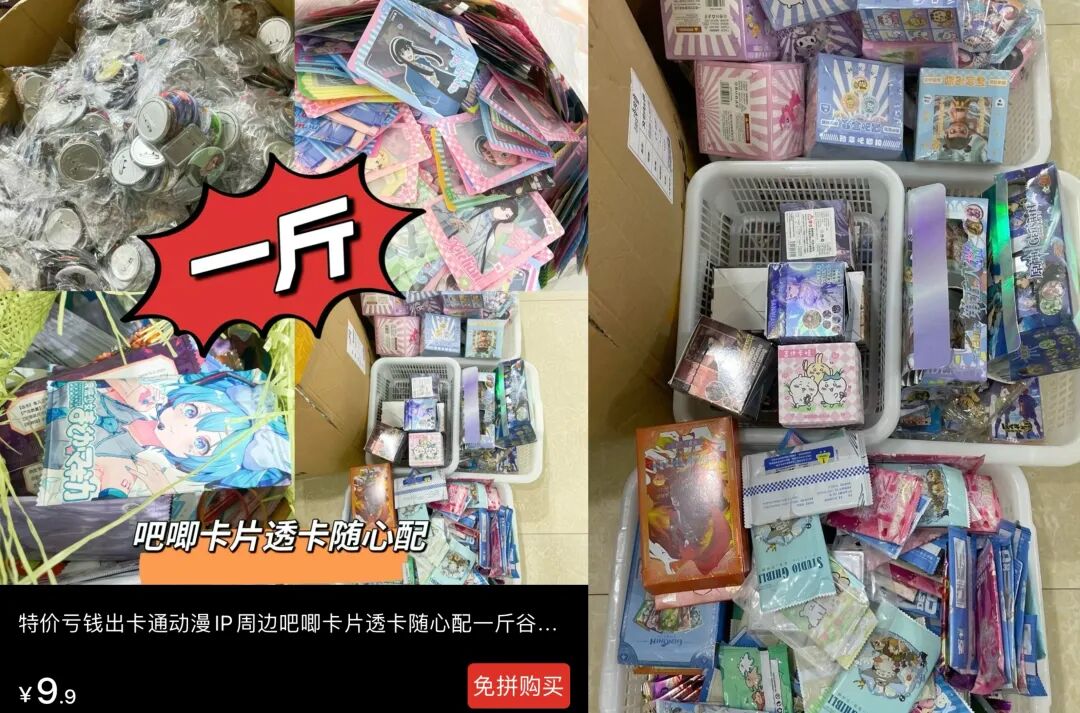 (需要特别指出的是,本文讨论的“谷子”一般是狭义概念,主要包括徽章、立牌、镭射票等印刷品,不包括收藏卡、毛绒玩偶、可动人偶、手办等品类。有工艺门槛的IP衍生品,价格也相对坚挺得多。)