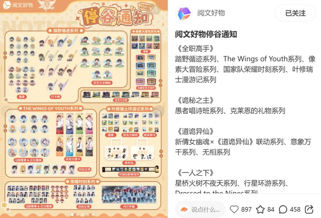 11月26日,阅文好物郑重发布“停谷通知”,承诺《全职高手》踏野循迹系列、《诡秘之主》愚者唱诗班系列等商品即日起正式停止生产,现有商品售罄后不再贩售。
