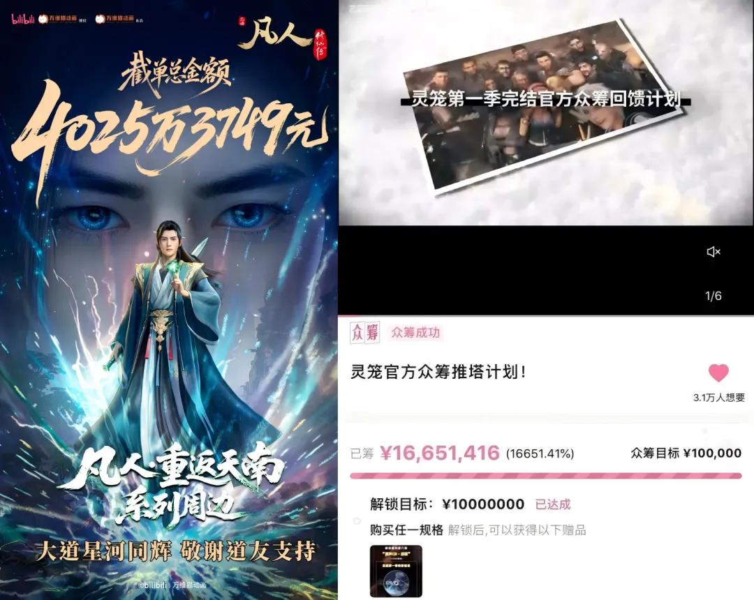 比如上个月(11月17日),B站会员购《凡人修仙传·重返天南》系列周边众筹截单,金额超过4000万元,打破年初《哪吒之魔童闹海》众筹的3212.8万元纪录,成为新的国产动画IP衍生品众筹冠军。