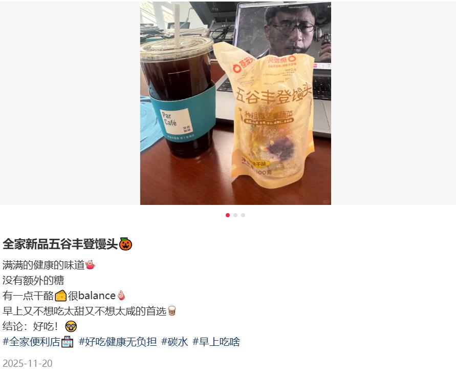 在消费者端,“五谷丰登馒头”也不断地刷存在感。从网友社媒分享来看,“五谷丰登馒头”进入了很多消费者日常生活中的场景。
