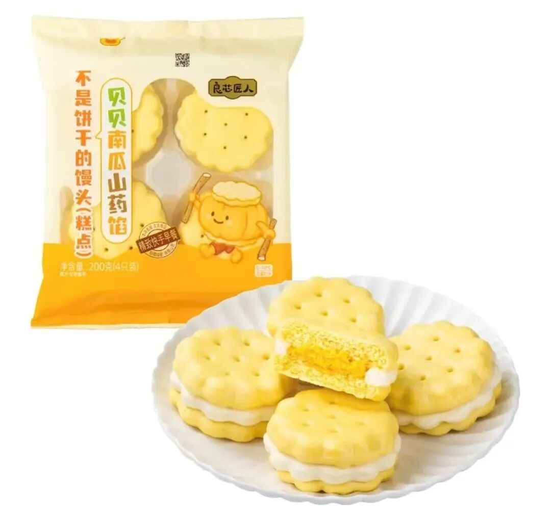 如良芯匠人“不是饼干的馒头”,将馒头做成夹心饼干的造型,这只“饼干”的夹心,则是馒头混合了贝贝南瓜泥和铁棍山药泥的内馅。