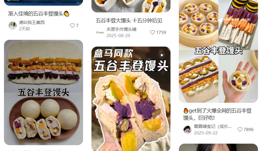 近半年来,社媒上出现了各式各样自制的“五谷丰登馒头”。它们虽然造型各异,但都延续着统一的视觉符号:展示在外的各色粗粮,以及点缀其中的白色奶酪。