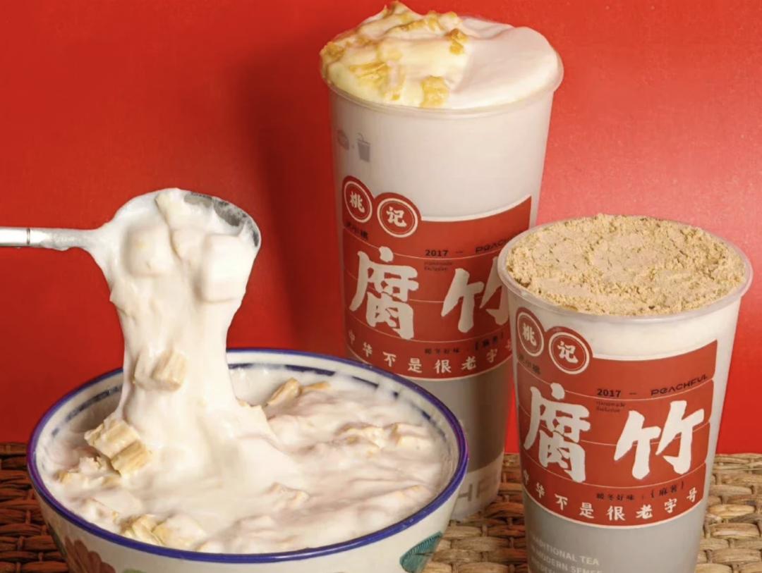 伏小桃在2022年曾创意地将泡发腐竹与麻薯同煮作为小料,豆香与米香相辅相成,韧性豆皮为饮品增加咀嚼层次。