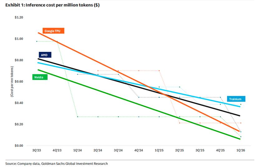 在这种“成本为王”的背景下,算力竞争版图正在重塑,高盛最近的一份报告指出,以谷歌TPU 为代表的专用架构正成为强有力的挑战者。报告数据显示,从 TPU v6到 TPU v7,谷歌已将每百万 token 的推理成本降低了约70%;英伟达的 GB 200 NVL72 每百万 token 的推理成本约为 0.27 美元,而谷歌的 TPU v7 在同样的任务负载下,成本已经降至相当甚至更优的水平。尽管英伟达仍毫无疑问是市场的主要参与者,其芯片成本曲线还将继续下行,但 TPU v7 的快速赶超甚至局部超越,则标志着算力竞争格局的转折点已经到来。