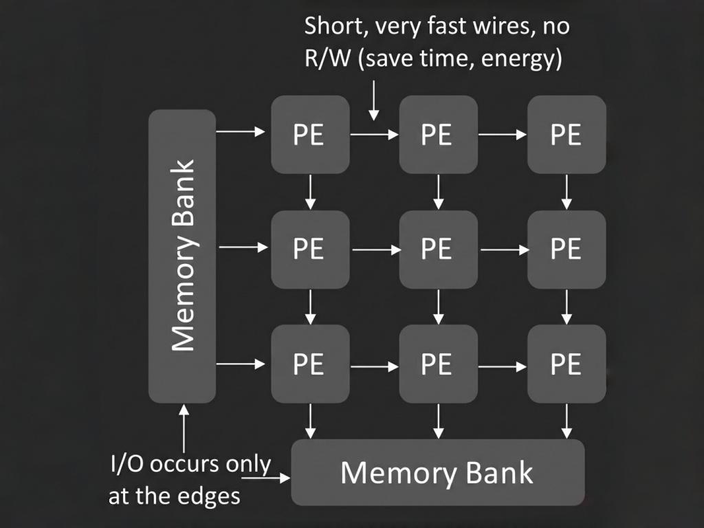脉动阵列示意图:数据在计算单元(PE)阵列中流动