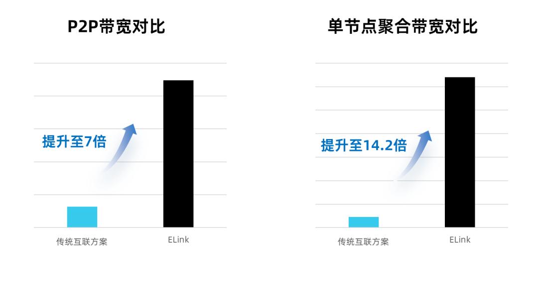 ELink互联方案的任意点对点带宽(P2P带宽),可以达到传统互联方案的7倍,根据不同的组网方案单节点聚合带宽则可以达到14.2倍,有效支持大模型的高速推理。
