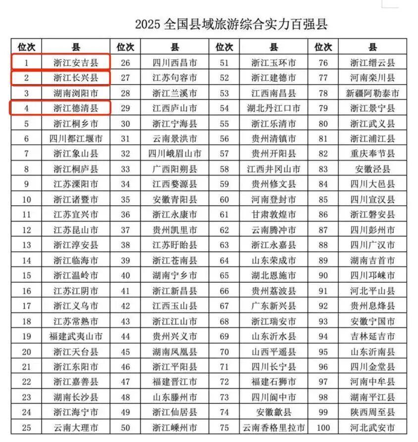 而在这激烈的竞争中,有一个城市脱颖而出,正是湖州。湖州下辖的三县——安吉县、长兴县、德清县,表现堪称惊艳,全部入选全国县域旅游综合实力百强县前十!